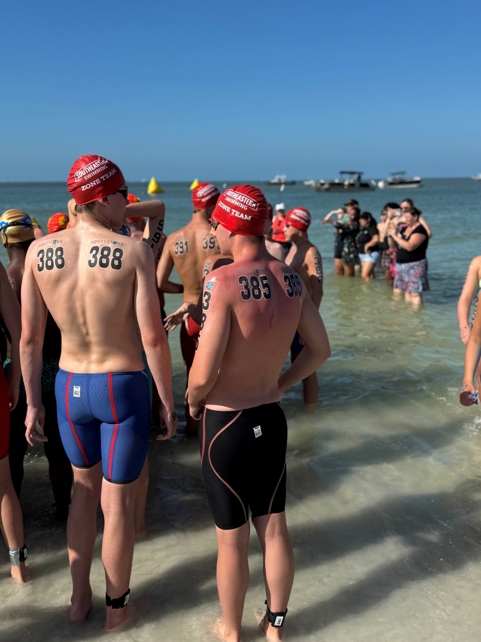 April 26, 2025 — Over 350 swimmers came together in Fort Myers, Florida to compete in the Southern Zone Open Water race. The 12 & Under age group competed in the 2K race while the 15 & Over age groups competed in the 5K race. Mitchell Maedel (Baylor Varsity) and Wyeth Carle (Baylor Swim Club) were selected by Southeastern Swimming to represent our LSC (local swim committee). This LSC goes to compete 14 other LSC in the Southern Zone – including North Carolina, South Carolina, Florida, and more.